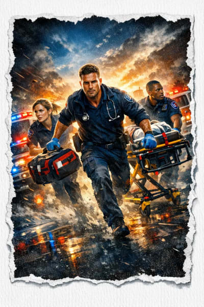 Action-movie-style poster, dynamic cinematic realism heroic wide-angle composition shown, paramedics in an action scene, background with patrol cars, fire trucks and ambulances with flashing lights dramatic sunlight and motion blur bold, high-contrast lighting like a summer blockbuster energetic poses, wind-swept clothing, cinematic depth color palette of deep blues, steel gray, bright whites, and pops of red and gold the entire image contained within a torn paper effect, jagged ripped edges with a clean white border surrounding the scene gritty texture, paper fibers visible powerful but community-focused tone modern action poster energy, cinematic realism, unified composition, the edges are white